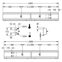 Anschlussfertige Armatureneinheit mit 3 Waschplätzen, für Wandmontage, zum Anschluss an Warm- und Kaltwasser von hinten rechts oder links. Gehäuse aus Edelstahl, matt geschliffen mit vormontierten Armaturenanschlussblöcken und Anschlussmöglichkeiten für Spannungs versorgung von elektronischen Armaturen, Edelstahlverrohrung, Einhängeleiste und Befestigungsmaterial. Gehäuseabmessungen 2400 x 173 x 72 mm (B x H x T) Waschplatzbreite 800 mm