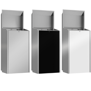Abfallbehälter für Unterputzmontage, Chromnickelstahl, Oberfläche seidenmatt, Front und Gehäuse mit InoxPlus Oberflächenveredelung zur Reduzierung von Fingerabdrücken und besseren Reinigungseigenschaften (easy to clean), Materialstärke 1,2 mm, Fassungsvermögen zirka 30 Liter, integrierte Sackhalterung, inklusive Montageleiste und Befestigungsmaterial. Abmessungen 304 x 790 x 251 mm (B x H x T)
