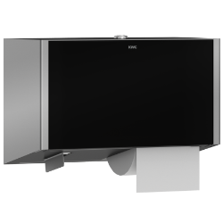 WC-Doppelrollenhalter mit Spindelsystem für Aufputzmontage, Chromnickelstahl, Oberfläche seidenmatt, Front schwarzes ESG-Glas, Gehä use mit InoxPlus Oberflächenveredelung zur Reduzierung von Fingerabdrücken und besseren Reinigungseigenschaft (easy to clean), Materialstärke 1,2 mm, geschlossenes Gehäuse, Zylinderschloss mit KWC Einheitsschlüssel, für zwei Rollen bis maximal 120 mm (D), Freigabe der nicht sichtbaren Reserverolle nach Verbrauch der ersten Rolle, inklusive Befestigungsmaterial. Abmessungen 280 x 193 x 147 mm (W x H x D)