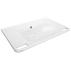 MEDCARE Einzelwaschtisch aus kunstharzgebundenem Mineralwerkstoff MIRANIT, mit porenfreier, glatter Oberfläche (temperaturbeständig bis 80 °C), Farbton Alpinweiß. Unterfahrbar, mit integrierten Haltegriffen, Ablageflächen, nahtlos eingeformter Mulde und Überlauf, ohne Armaturenbohrung. Befestigung an Beckenrückwand. Hintere Schwallkante, inklusive Befestigungsmaterial. Abmessungen 850 x 150 x 550 mm (B x H x T) Muldenmaße 500 x 117 x 415 mm (B x H x T)
