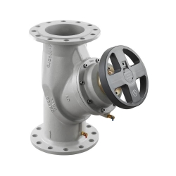 OVENTROP-"Hydrocontrol VFN" Strangregulierventil PN 25 in Schrägsitzausführung mit gesicherter, jederzeit kontrollierbarer, stufenloser Voreinstellung durch Hubbegrenzung. Ventilgehäuse aus Sphäroguss (EN-GJS-500 DIN EN 1563), Kopfstück (DN 200 - DN 300 aus Sphäroguss) und Kegel aus Rotguss, Spindel aus entzinkungsbeständigem Messing, Kegel mit Dichtung aus PTFE, wartungsfreie Spindelabdichtung durch doppelten O-Ring aus EPDM. Voreinstellung plombierbar. Alle Funktionselemente auf der Handradseite, Meßventil und F+E-Kugelhahn untereinander austauschbar. Mit montiertem Zubehör-Set 2 =2 Meßventile G 1/4" Nadeltechnik. Beiderseits Flanschanschluss DIN EN 1092-2.Material: Sphärogusskvs: 814.5Nennweite: DN 200max. Betriebsdruck: 25 barmax. Betriebstemperatur: 150 °C Art.-Nr.: 1062456 EAN: 4026755241167