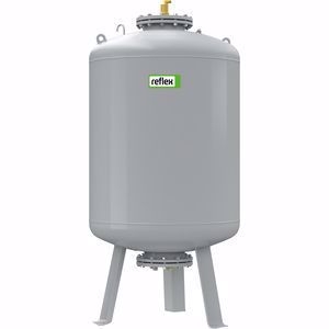 Membran-Ausdehnungsgefäss für Reflex Variomat 1 und 2, pumpengesteuerte Druckhaltestation, drucklos, gegenüber der Atmosphäre geschlossen, gebaut und geprüft nach DIN EN 13831 und Richtlinie Druckgeräte 97/23/EG. Aus Stahl aussen beschichtet, Wasser in der austauschbaren Butyl-Membrane sicher vor Sauerstoffzutritt geschützt, mit patentierter Peilrohrentgasung. Auf angeschweissten Stahlfüssen.