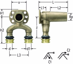 | Rp | d | d1 | z | L | L1 | L2 | L3 | H1 | H2 | x | ζ1 | ζ2 | Grösse | Art.-Nr. | VE | suissetec |